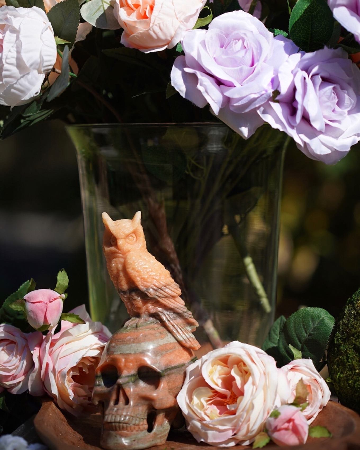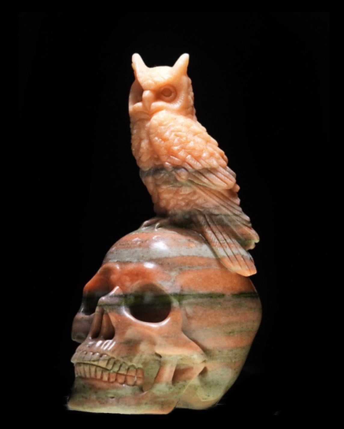 This yellow calcite carved skull with the owl perched on top is sure to bring a watchful eye over any household. She’s a great addition to any to any crystal skull collection and reminds us of ancient feminine wisdom and bravery. Her pink, gray, and green tone create a beautiful color palate. Standing 8 inches high and 3.5 inches wide.