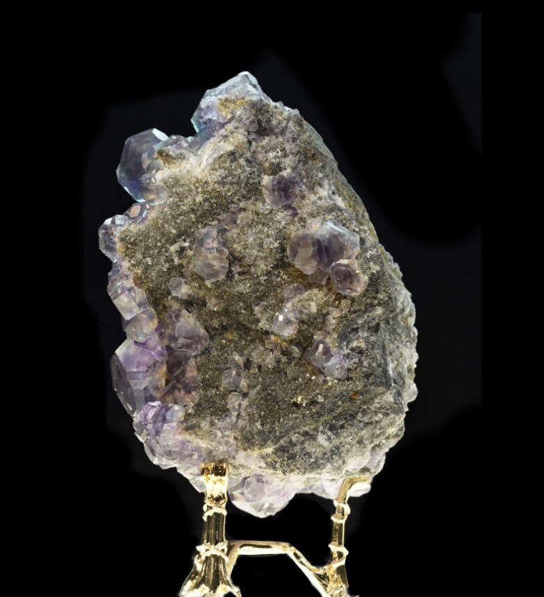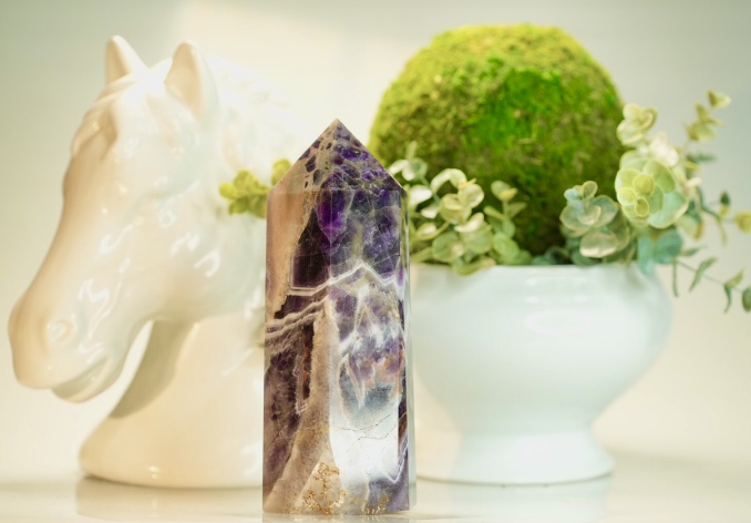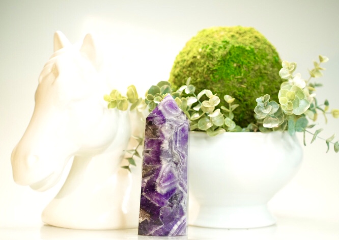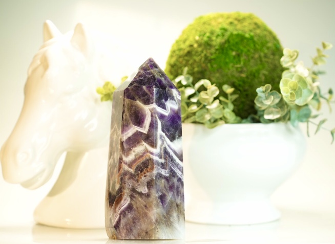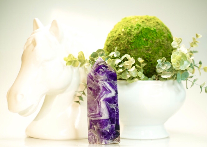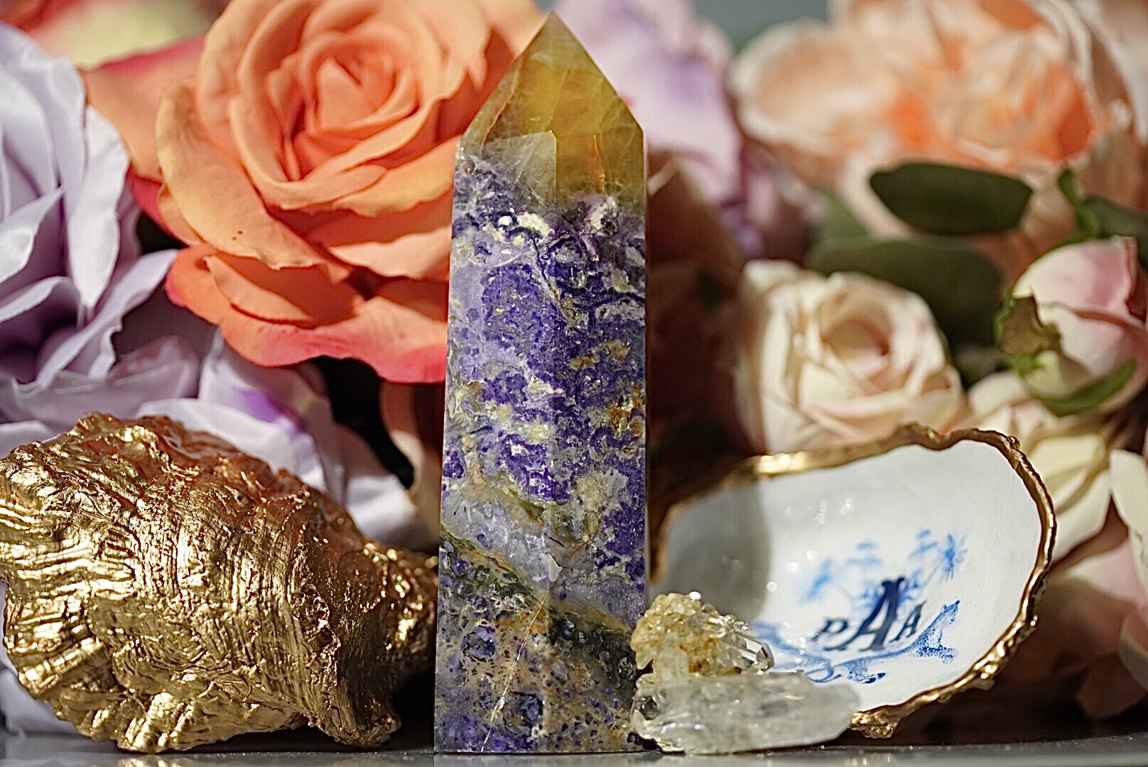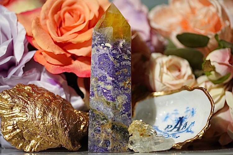 This Lepidolite girl is a knock out…sure to win best dressed at any party. Standing 6 inches tall and 1.5 inches wide. Attractive in any light, but well lit areas help her golden point really pop . This stone is said to have a high vibrational energy that diffuses negativity and stabilizes mood swings. Lepidolite is a mineral that contains lithium which is commonly used for anxiety. Beauty and function , she’s ready to look fabulous in her forever home.