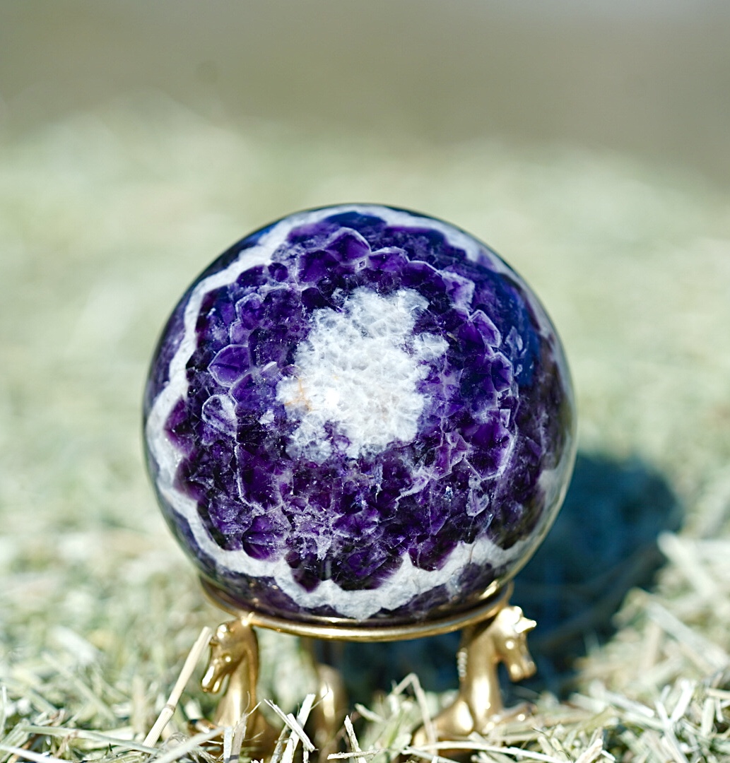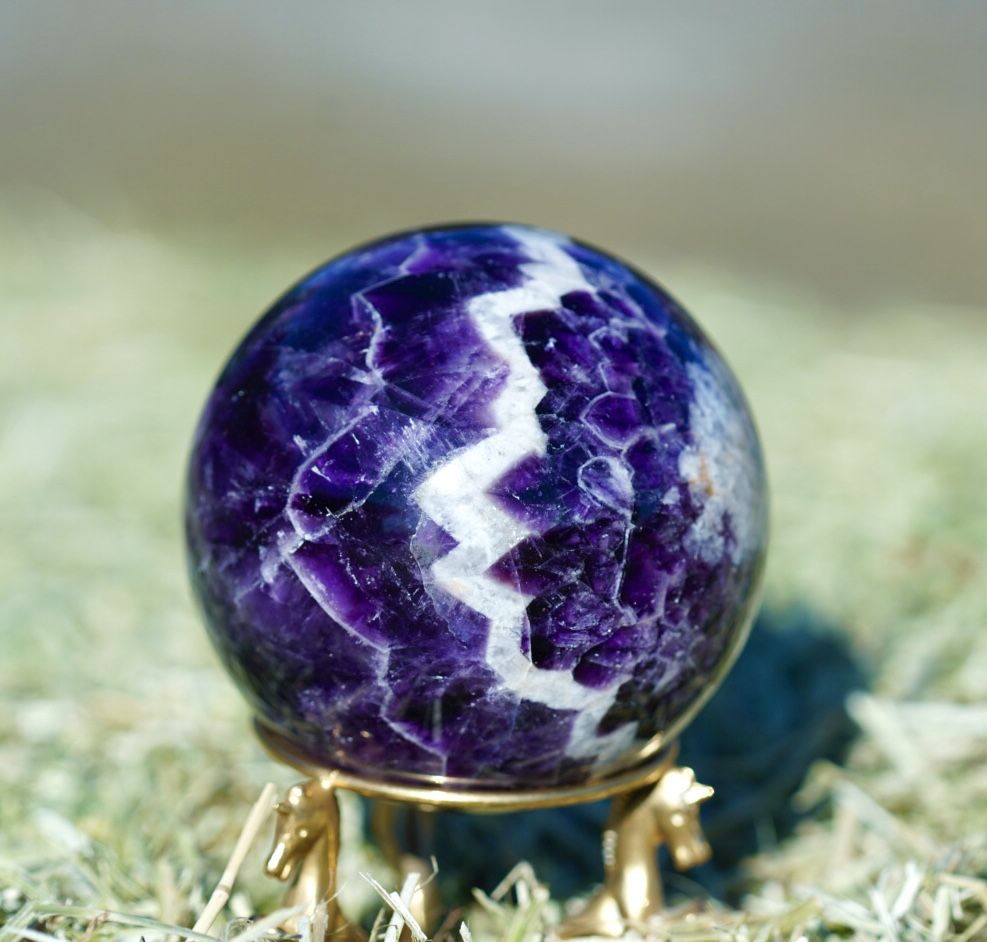 Here’s looking at you kid. This hearty dream amethyst sphere has patterning resembling an eye ball. Breathtaking in any light, and a great addition to any crystal ball collection! Amethyst is an obvious choice for increasing intuition and communication. Aiding is balancing emotions, positive transformation, and spiritual awareness.