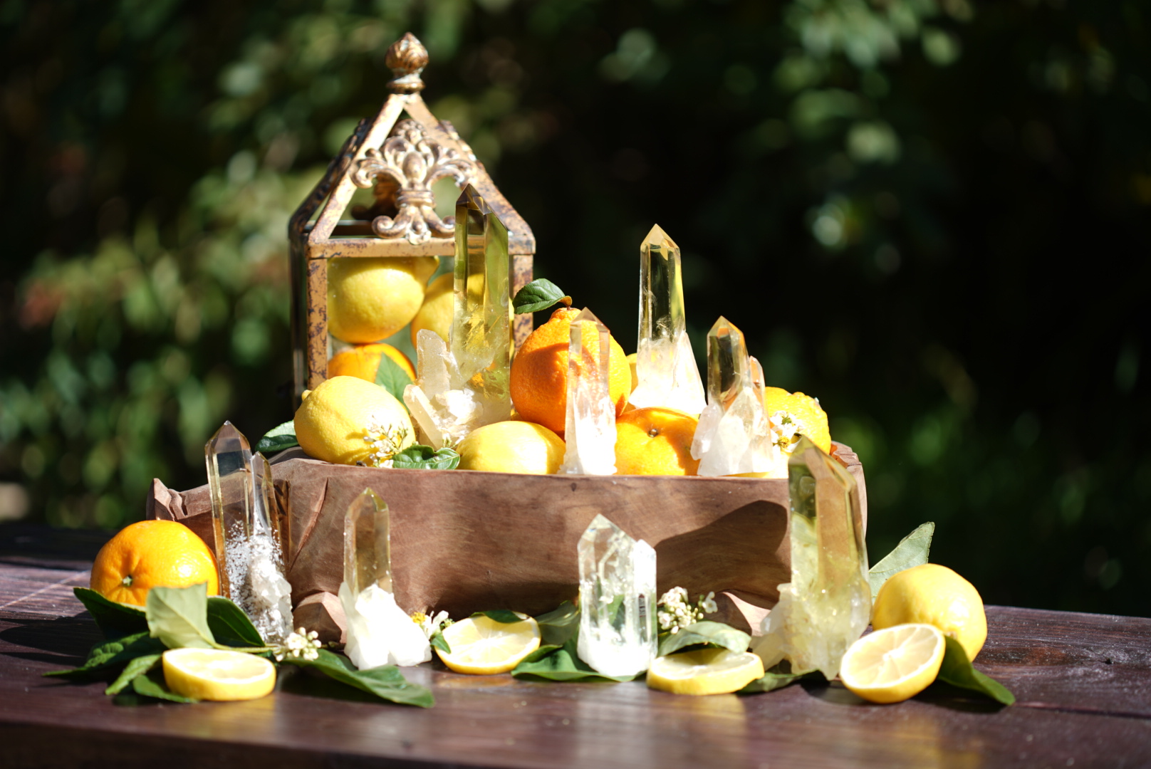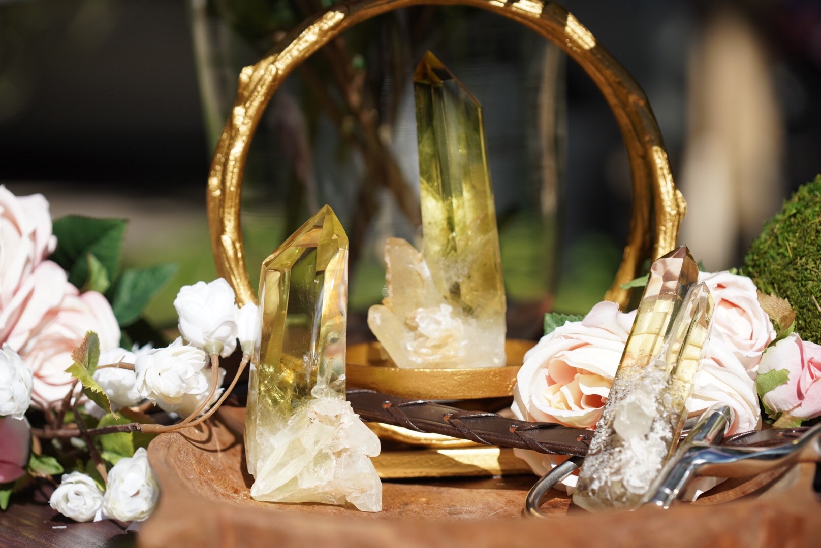 This tall citrine quartz is special . Hickory has more of a greenish hue in the shade, along with one smokey stripe on the top of his tower. He carries a very earthy and garden chic vibe . Hickory is featured in the middle of this group shot.