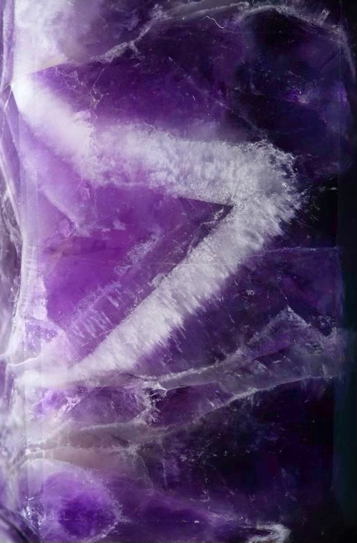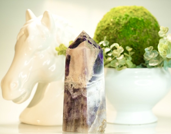 Winter is a large dream amethyst tower standing 7.5 inches all and 3.25 inches wide. There is something so real and mesmerizing about this non traditional form of amethyst. Who can be perfectly clear all the time? Dream amethyst reminds that there is unknown beauty in complexity and diversity. Winter is certainly not your ordinary clear amethyst tower. We hope she finds a special home.