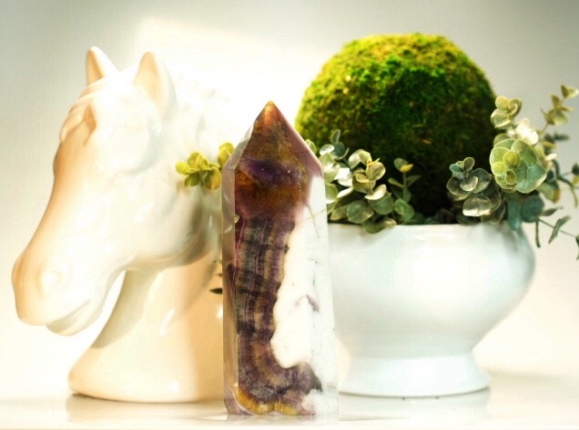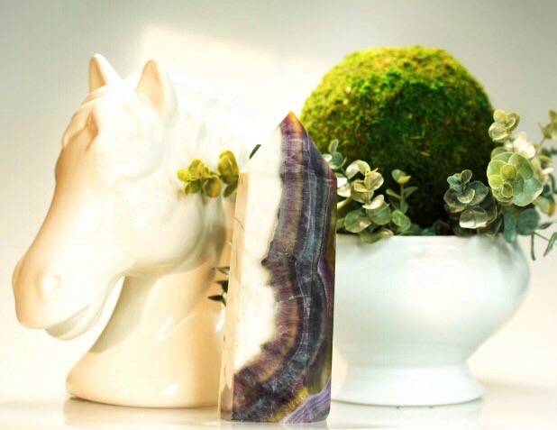 Fell in love with this fluorite tower. Lydia is certainly not out of the typical fluorite tower box, her white markings make her a somewhat of a statement. She would make a gorgeous book end or table top decor piece. If she stays with us forever were not going to be upset! She does have a slight lean that does not get in the way of her standing on her own, easily fixed with a tiny dab of modeling clay or minor plastic surgery from a local jeweler. Standing inches 7.75 high and inches 3 wide.